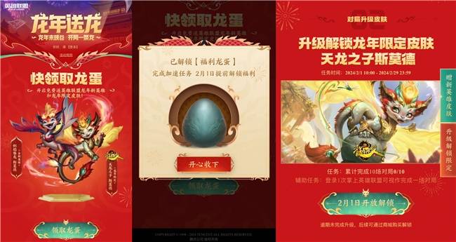 在活动期间,进入“龙年送龙”活动页面就可以免费领取一份龙蛋!成功孵化后,就能免费获得新英雄炽焰雏龙·斯莫德,解锁龙年限定皮肤天龙之子·斯莫德了,最快2月1日就能直接领取体验!