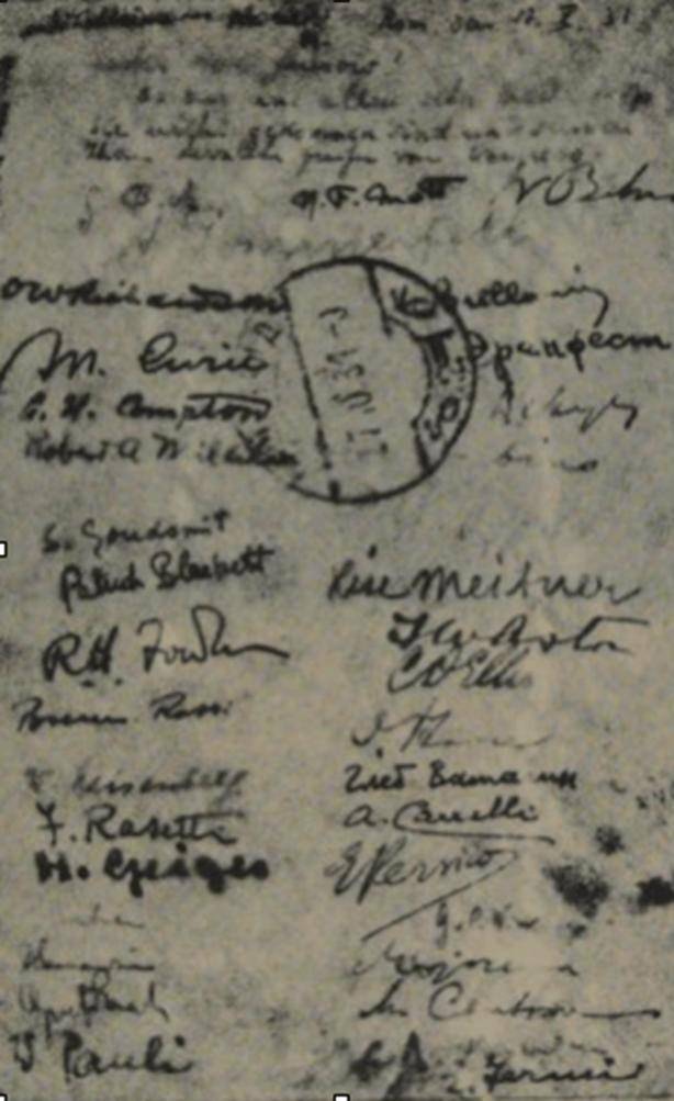 让我们欣赏下这些签名者:居里夫人(Madame Curie)、康普顿(A. H. Compton)、密立根(Robert Millikan)、海森堡(Werner Heisenberg)、盖格(Hans Geiger)、泡利(Pauli)、费米(Fermi)……。不用多说,年轻的伽莫夫在国际学术界已经得到了相当的认可。