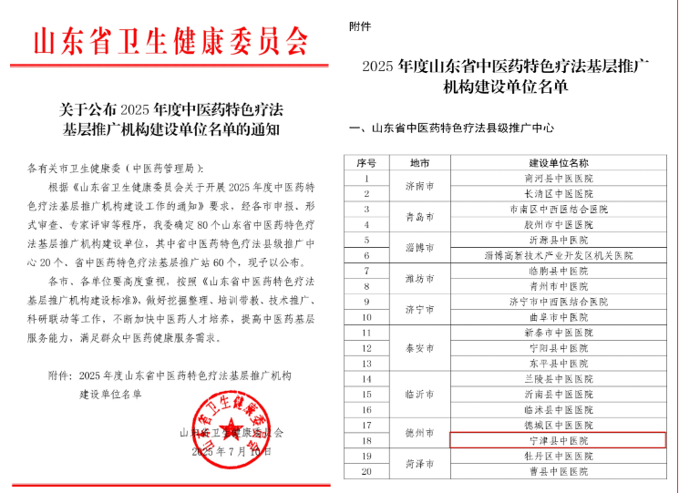 7月10日,宁津县中医院成功入选“山东省2025年度中医药特色疗法基层推广机构建设单位”名单。这是对医院长期以来扎根基层、传承创新中医药特色技术、服务百姓健康卓越成效的权威认可,标志着医院在推动中医药事业高质量发展、促进优质资源下沉基层方面迈出了更加坚实的步伐。