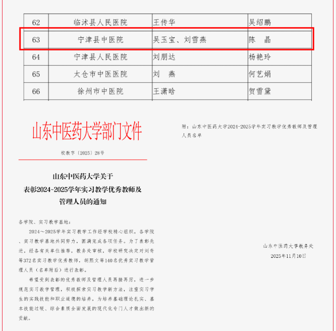 山东中医药大学公布了2024-2025学年实习教学优秀教师及管理人员名单,宁津县中医院康复科吴玉宝、耳鼻喉科刘雪燕荣获实习教学优秀教师,党委委员、医务科主任陈晶获优秀实习管理人员称号。