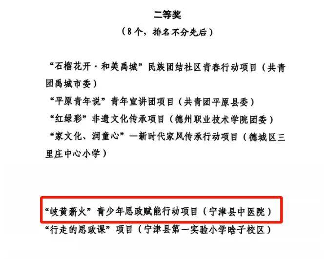 7月28日,共青团德州市委正式公布德州市青少年思想政治引领优秀品牌项目评选结果。宁津县中医院申报的“岐黄薪火”青少年思政赋能行动项目经过初筛评选、综合评选在全市65个项目中脱颖而出,荣获二等奖殊荣。