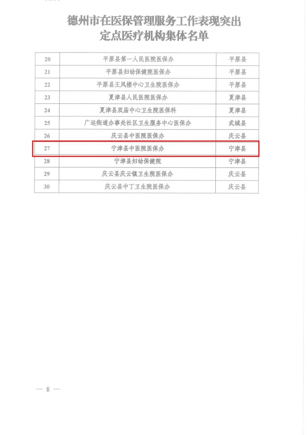 德州市医疗保障局通报表彰了2024年度在医保管理服务工作中表现突出的集体,宁津县中医院医保科荣获医保管理服务工作表现突出定点医疗机构集体名单,这既是对医保科既往工作的充分肯定,更是对今后工作的鞭策与激励。