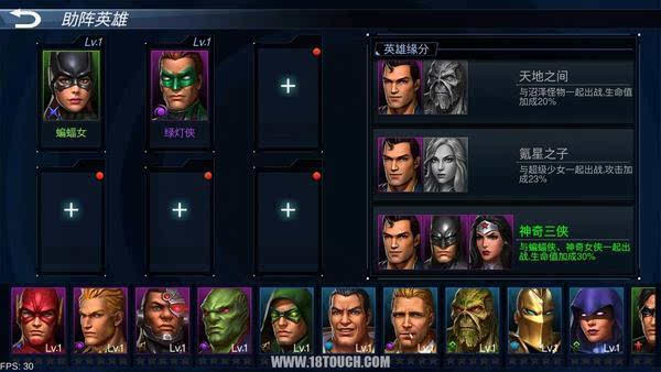 整整20名英雄,如果一个一个玩的话想把所有英雄体验一遍可能都要很长的时间,说到这就不得不提一下这款游戏的另一个特点了。三角色同时作战,玩家可以同时选择三名英雄一起出阵,还可以选择6名英雄为助阵英雄。这九名英雄还会根据原著中的剧情产生特殊的“羁绊”得到不同的属性加成。例如当你选出正义联盟的3位头牌时,可以获得“神奇三侠”buff,对三位英雄进行不同的属性加成。这3名出战英雄以及6名助阵英雄如何选择,如何获取,如何培养也是对一名玩家的能力的一次考验。