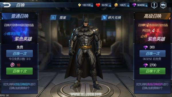 游戏中的英雄可以通过抽卡以及英雄碎片去兑换,其中英雄碎片可以通过开箱子,扫图,过剧情做活动等获得。抽卡则分为普通以及高级,其中普通每天有3次的免费机会,高级每天有一次免费机会。其中英雄分为紫色品质,蓝色品质,绿色品质。根据我的目测,这个品质应该是按照英雄在漫画中的戏份(实力)来分,例如超人、蝙蝠侠、神奇女侠就是紫色。不过不同颜色只是代表了珍稀度的不同,小编拿着试玩账号抽了一下午一个蝙蝠侠都没有看见,想要蝙蝠侠的玩家估计要花点功夫去攒碎片了。初始能力值来看,只是根据不同的定位有细微的差距。例如神奇女侠定位是MT,升级和强化获得的血量防御加成就比较多,蝙蝠侠定位是DPS,升级强化获得的攻击加成就较高。这点来说还是比较公平的,也为游戏的MOBA元素打下良好的基础,降低了氪金玩家跟平民玩家的差距。
