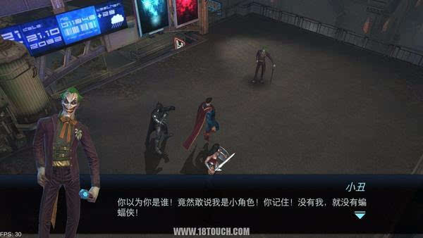 游戏大致分为两个方向,以剧情为主的战役模式和以对抗为主的对战模式。其中战役模式共有14个大关,每一关又分别有12个小关以及1个boss关。每一个boss关都有一名让玩家耳熟能详的反派角色坐镇,例如第一关就是大名鼎鼎的小丑,小丑可以说是整个美漫里最著名的反派之一了,游戏中的小丑不论是从造型亦或是台词动作都很好的诠释了原著中的小丑,一名因为蝙蝠侠而生,所有的戏份都是为了跟蝙蝠侠做对的反派。